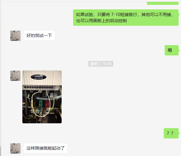 一次線和二次線都接好后,現(xiàn)場(chǎng)電工還是說(shuō)啟動(dòng)不了,于是拍了圖片過(guò)來(lái),如上圖。結(jié)果一看就知道原因了。因?yàn)樗?-9短接了,并沒(méi)有按照說(shuō)明書(shū)上的接法接線,于是就怎么也啟動(dòng)不了。